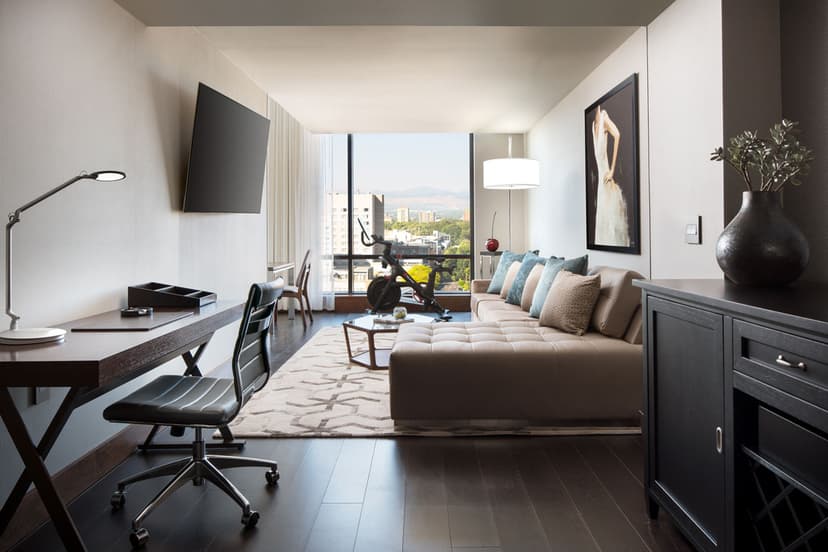 The Mountain Studio Suite offers outstanding views of Denver and rugged peak-strewn vistas. It includes a luxurious king-sized bed, a spa-like rainfall shower, a minibar with a refrigerator, a spacious sitting area and other amenities to enhance your stay. Surrounded by windows on all sides, the suite is bathed in natural light throughout the day. It’s the hotel’s largest room and, like the others, features a modern, minimalist arrangement with earthy tones that makes it hard to leave.
